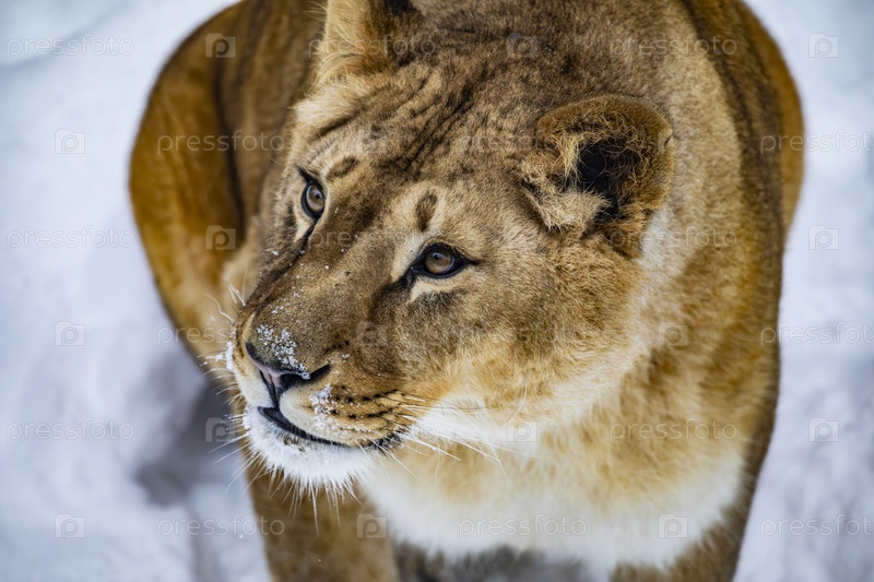 Львица в снежном лесу, крупный план