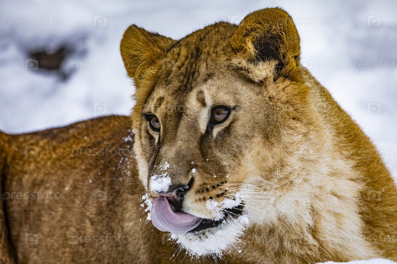 Львица в снежном лесу, крупный план
