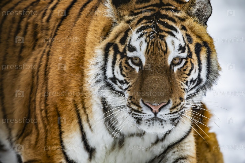 Амурский тигр в снежном лесу, крупный план