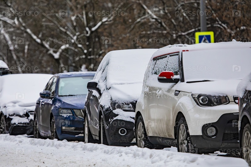 Автомобили, припаркованные под снегом на улице зимнего города