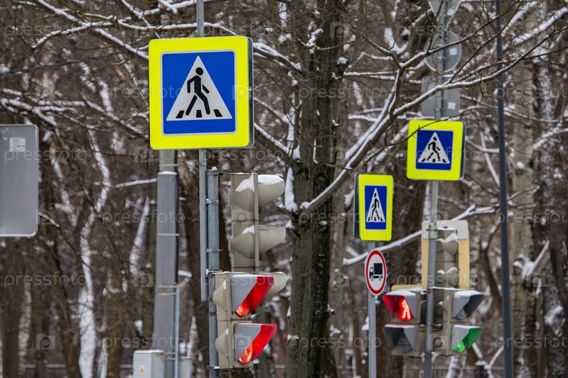 Пешеходный переход и светофоры на улице зимнего города