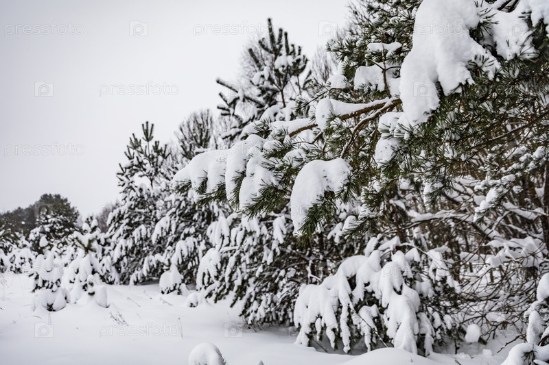 Снежно покрытые хвойные деревья в зимнем лесу