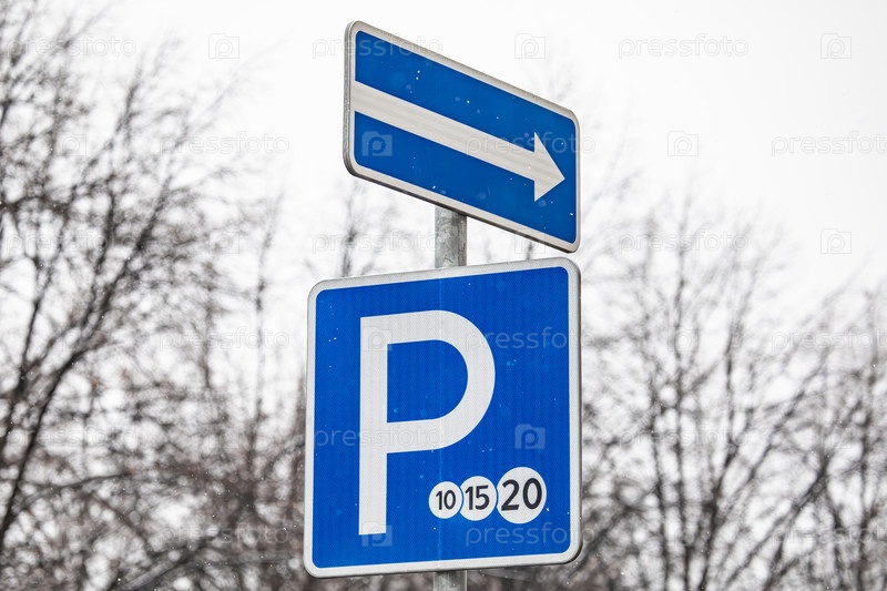 Дорожный знак платного парковки с стрелкой в одну сторону в зимнем городском пейзаже