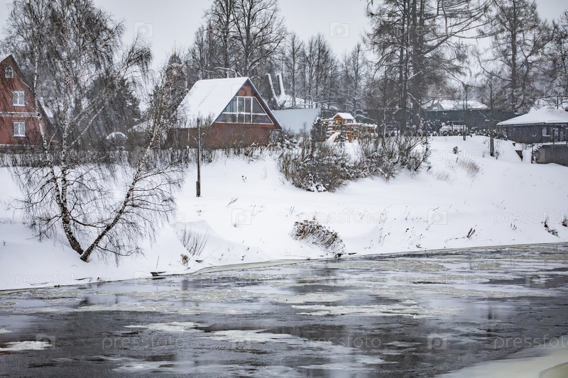 Зимний сельский пейзаж с рекой Москвой и загородными домами