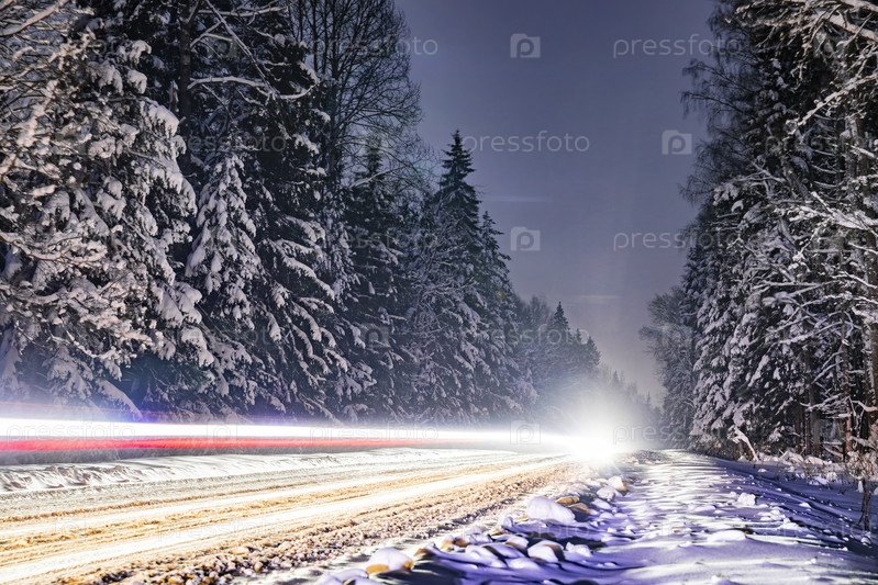 Ночная зимняя лесная дорога с световыми линиями от фар автомобилей