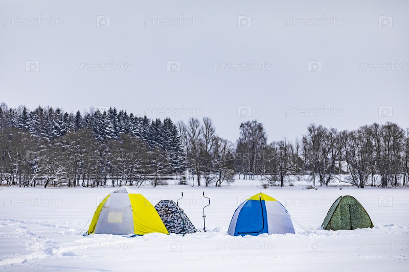 Зимняя рыбалка в палатках на замороженном озере