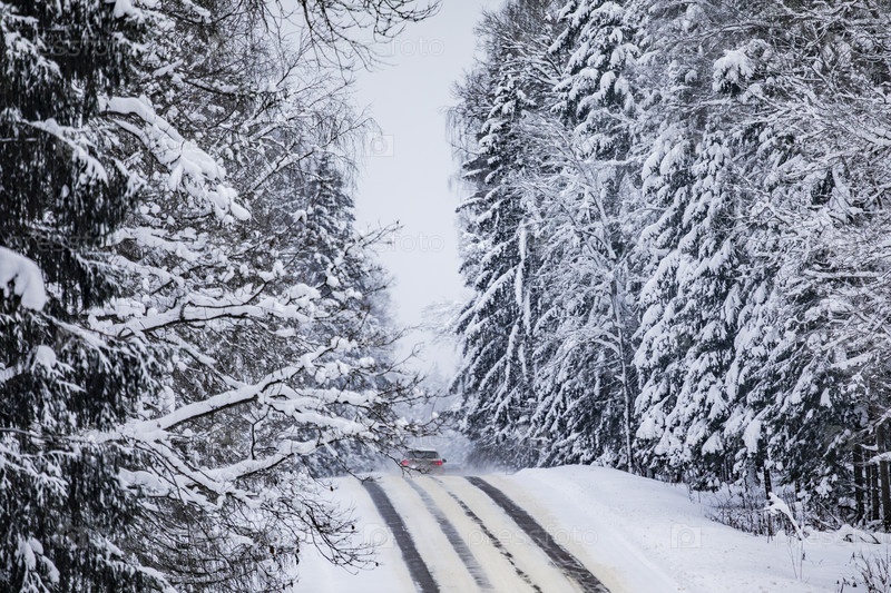 Зимняя дорога через заснеженный пихтовый лес