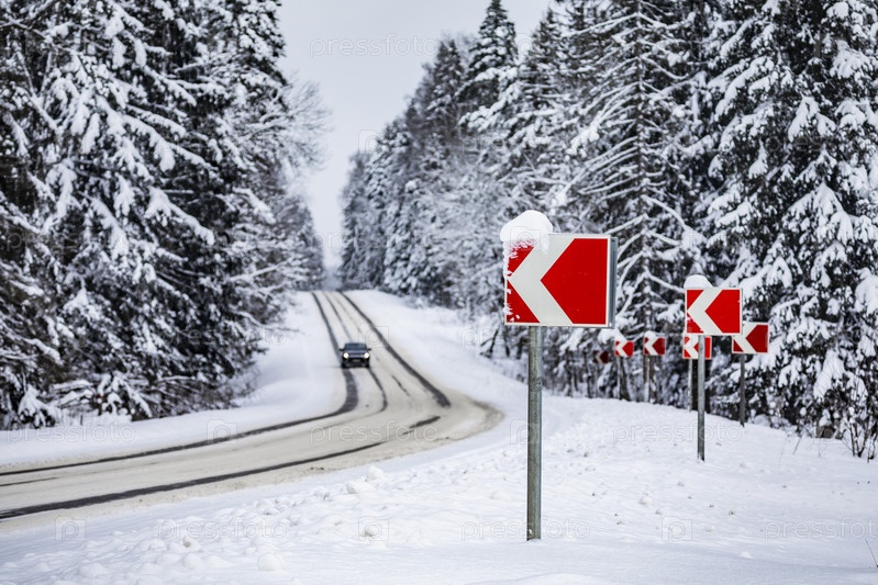 Зимняя сельская дорога с поворотом и дорожными знаками в лесу