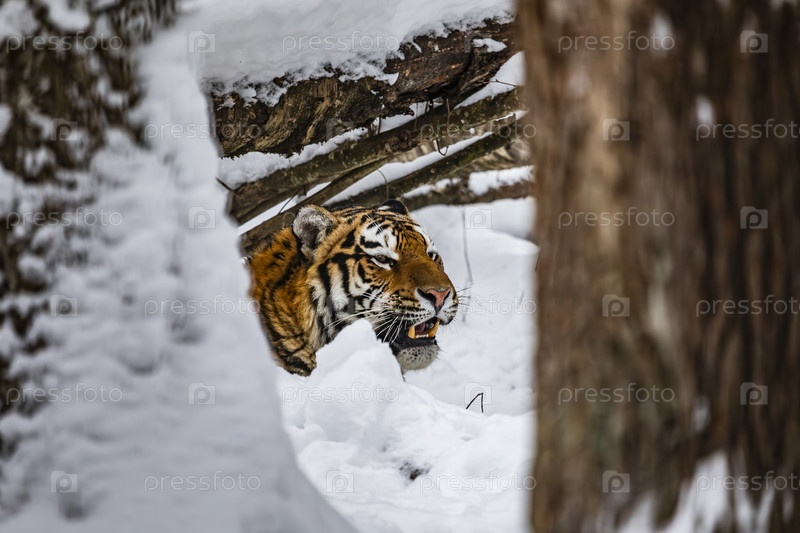 Амурский тигр в снежном лесу