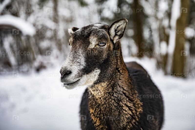 Европейский муфлон на снежной лесной тропе зимой, крупный план