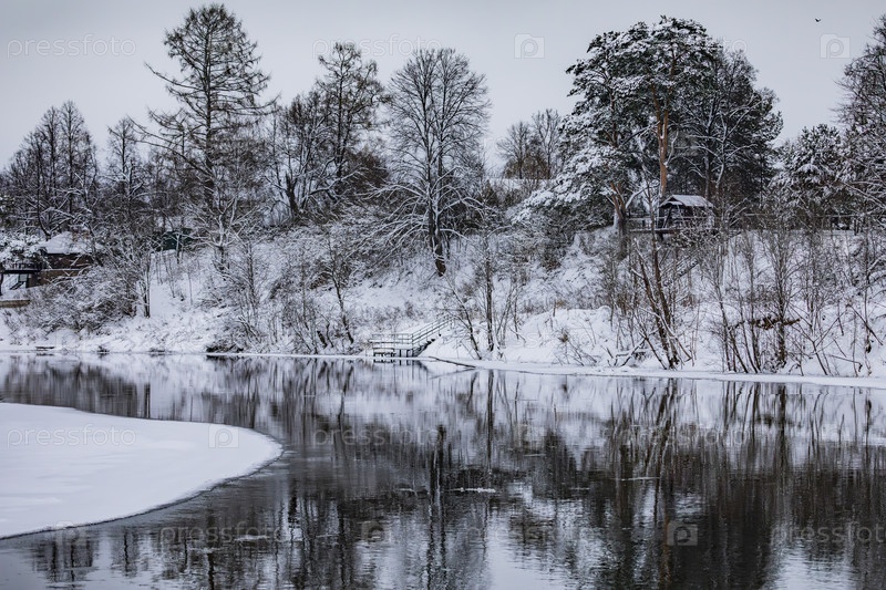 Зимний речной ландшафт со снежным лесом и облачным небом, Московская река