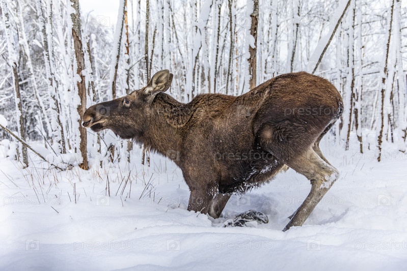 Лось в глубоком снеге зимнего леса