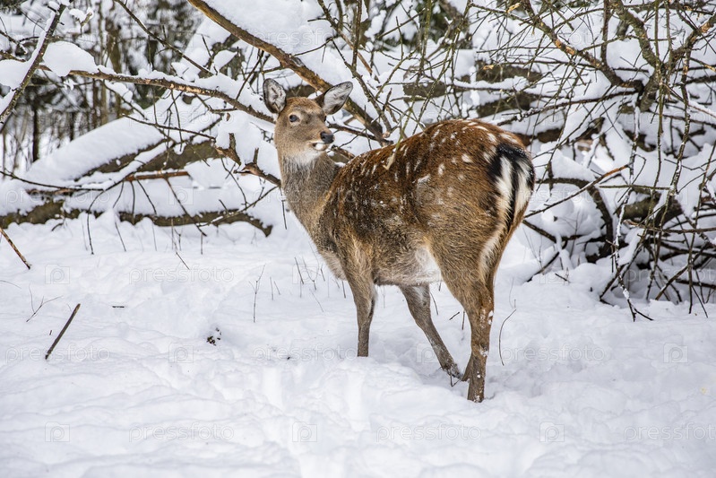 Обнаружен олень в зимнем снежном лесу