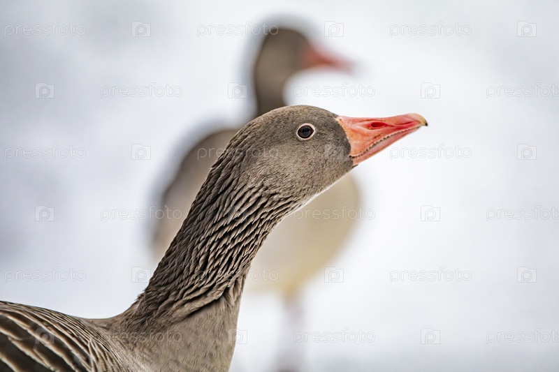 Серый гусь (Anser anser) крупный план в снегу
