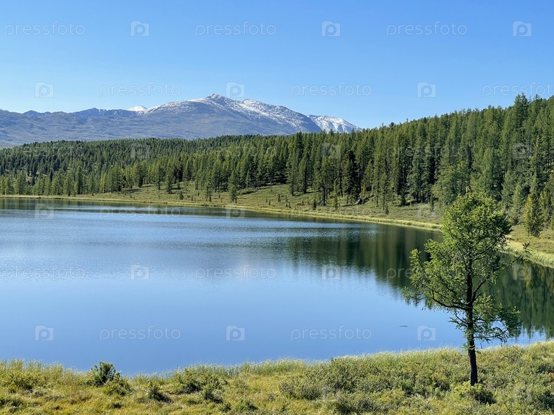 Горное озеро и высокие заснеженные вершины Алтая, Россия