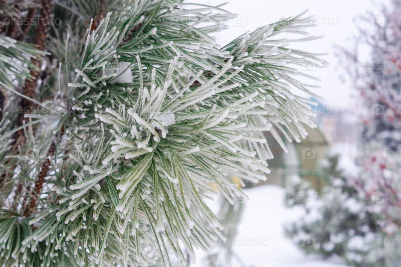 Зеленые сосновые иглы в морозе крупный план на фоне других заснеженных деревьев и теплиц