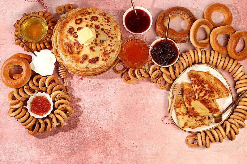Баннер Shrove с вкусными блинами с мягким сыром, медом, вареной мармеладкой, сметаной, икры и бегелями, прецеллами на праздничном столе, концепцией традиционной русской кухни. Рекламное меню для кафе