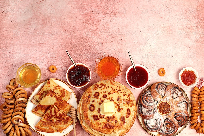 Вкусные российские блины с мягким сыром, медом, вареной мармеладкой, сметаной и бегелями, прецеллами на элегантном праздничном столе. Масленица и традиционная русская кухня. Кафе рекламный баннер