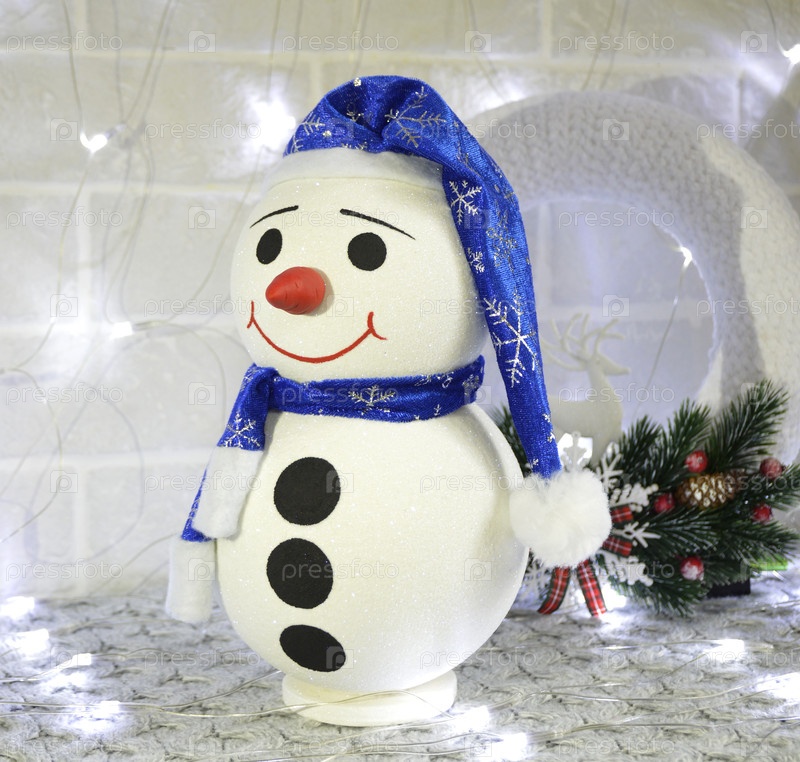 Красивый снеговик в синей шляпе и с хорошей улыбкой на фоне гирлянды. игрушка для подарка или украшения комнаты к Новому году или Рождеству. теплота и доброта