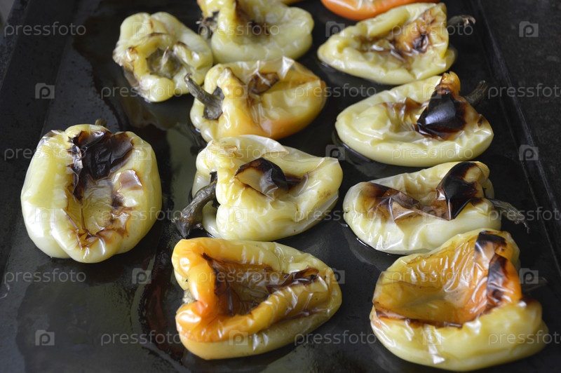 Печеный перец на черном хлебобулочном листе. приготовление вкусной и здоровой пищи. диетический продукт. жареные перцы. полезные овощи
