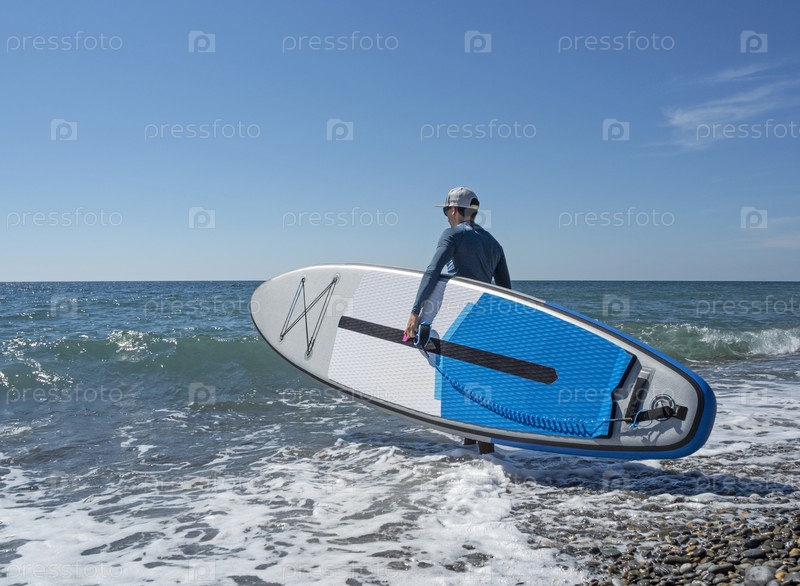Мужчина с SUP на пляжном серфинге в летний солнечный день