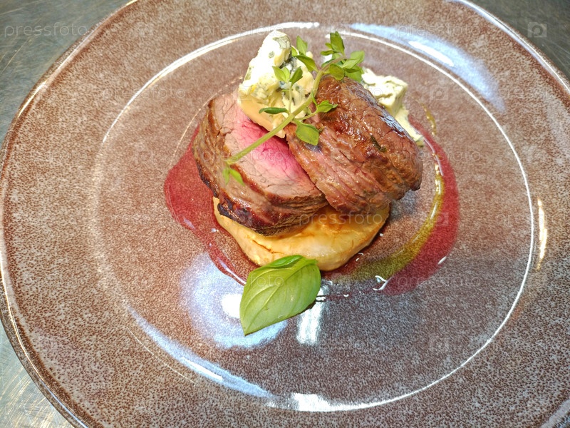 Бифштекс телячий минион средне-редкий с кусками голубого сыра и сливочного соуса. украшен зелеными ветвями. вкусный и обильный ужин или обед. правильное и здоровое питание