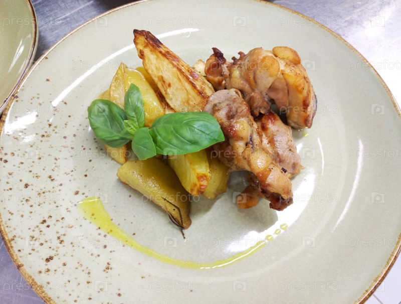 Куриное филе и картофельные клинки с ветвью базилика на белой тарелке. вкусная и здоровая пища для обеда или ужина. правильное питание