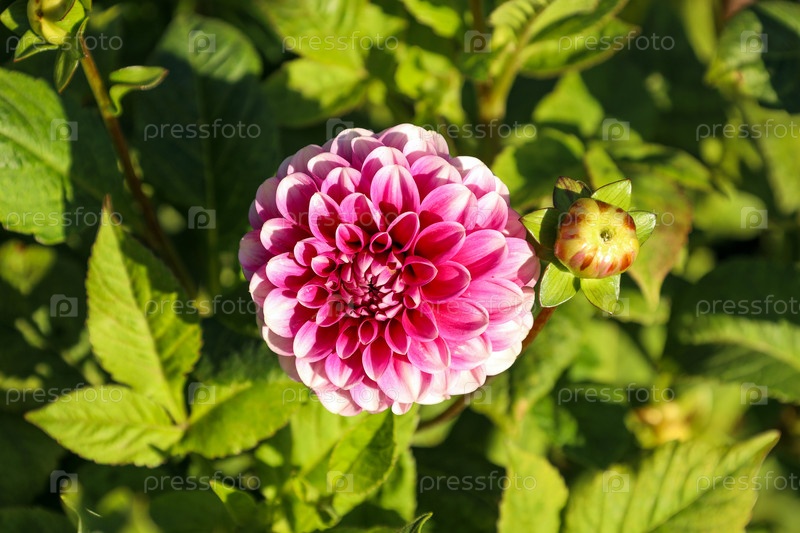 Розовый цветок даллии и нецветающий бутон на зеленом кусте