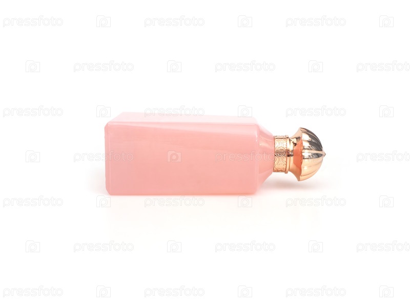 Элегантная бутылка бледного розового парфюма с золотой крышкой, изолированной на белом фоне, резка готова. очень высокое разрешение