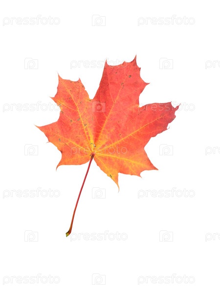 Один ярко-красный кленовый лист изолирован на белом фоне, вырез готов