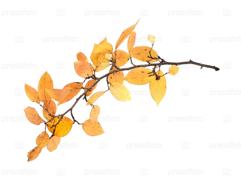 Изолированная на белом фоне изогнутая ветвь с желтыми осенними листьями, резка готова. очень высокое разрешение