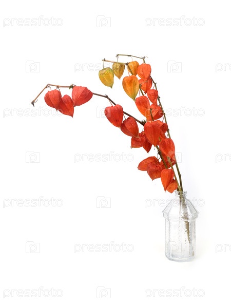 Букет сушеных китайских фонарей в текстурированной стеклянной вазе на белом фоне, вырезка готова. очень высокое разрешение