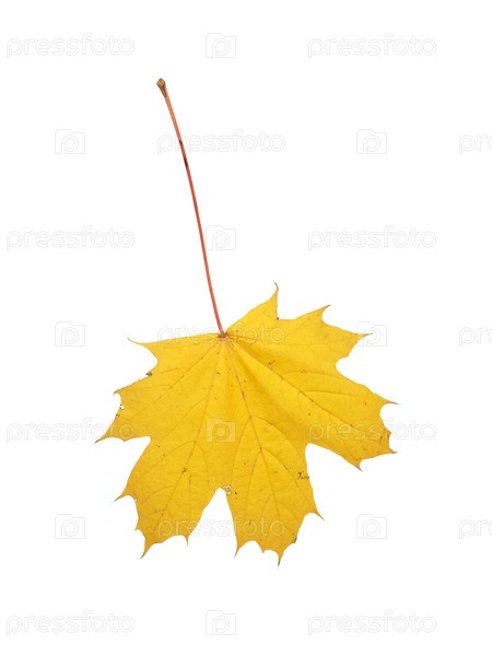 Один ярко-желтый кленовый лист изолирован на белом фоне, вырез готов. очень высокое разрешение
