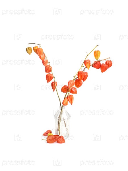 Букет сушеных китайских фонарей в текстурированной стеклянной вазе на белом фоне, вырезка готова. очень высокое разрешение