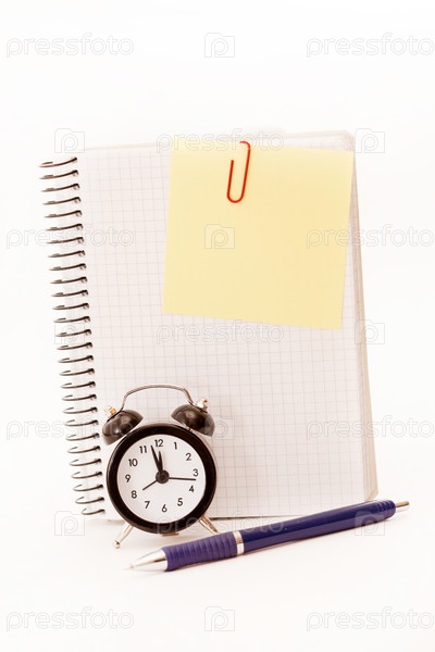 Будильник и блокнот на белом фоне