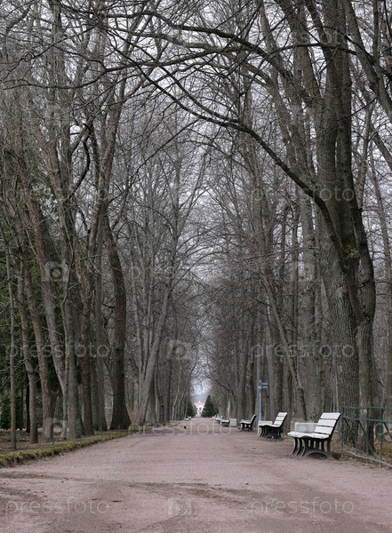 Пейзаж в весеннем парке: переулок и деревья без листьев