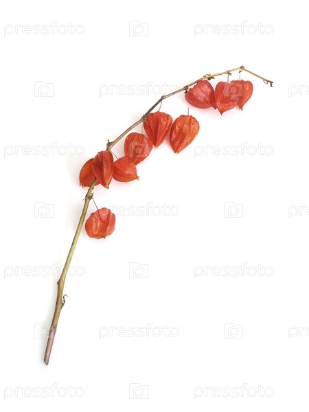 Вертикальный стебель китайского фонаря (Physalis) с оранжевыми ягодами, выделенными на белом фоне, резка готова