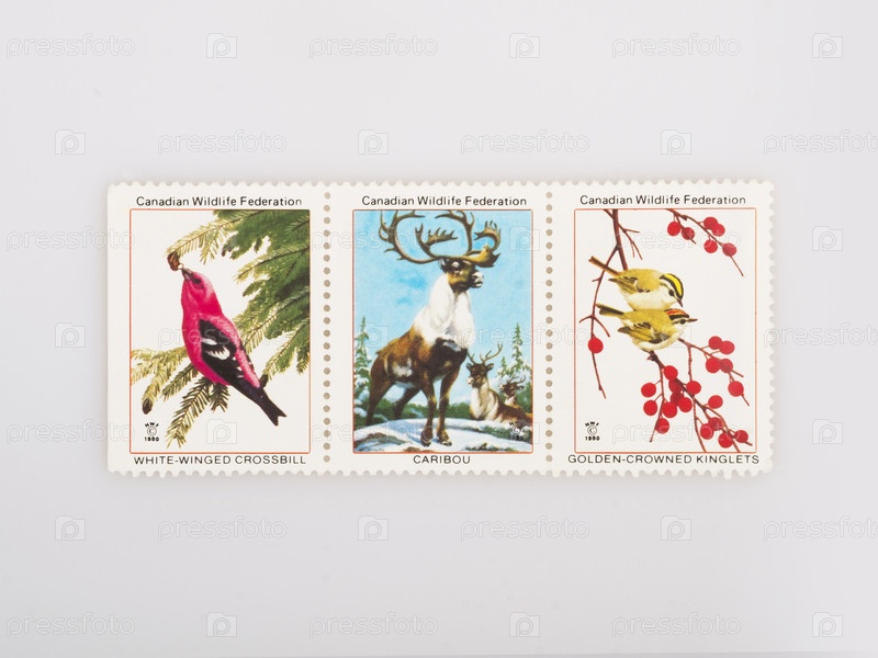 Канадские почтовые марки с изолированными птицами и животными на белом фоне