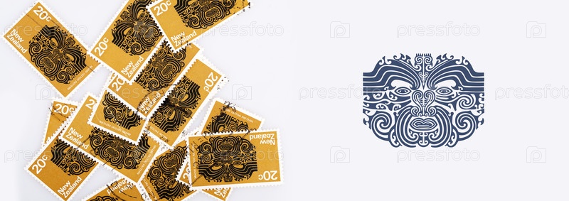 Почтовые марки Новой Зеландии с татуировкой маори, изолированной на белом фоне
