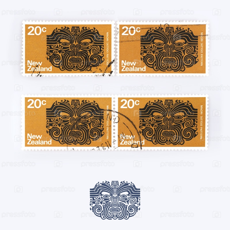 Почтовые марки Новой Зеландии с татуировкой маори, изолированной на белом фоне