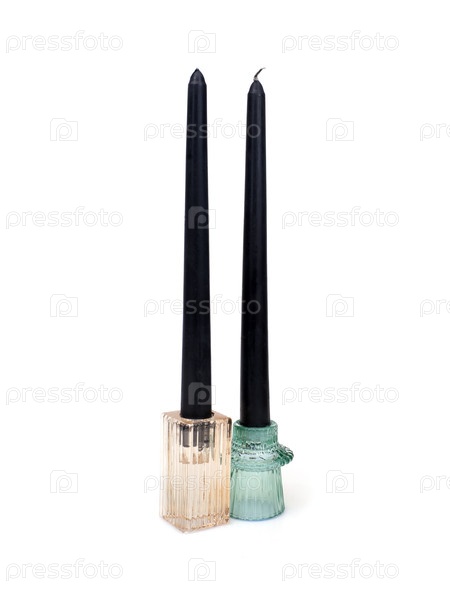 Пара черных свечей в современных стеклодержателях: текстурированное золото и зеленое, изолировано на белом фоне, вырезка готова. очень высокое разрешение