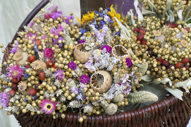 Осенью собирают корзину с сухими цветами, шишками и семенами
