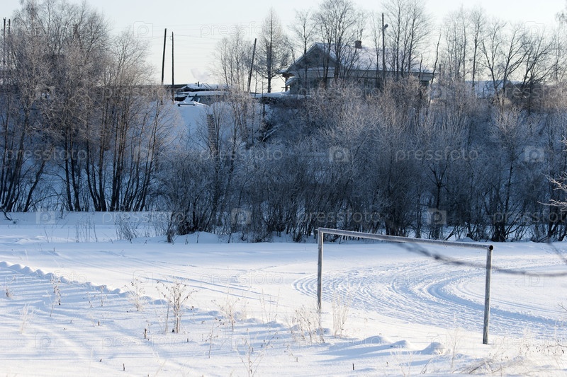 Зимний сельский ландшафт со снежными домами и деревьями под голубым небом в летний день