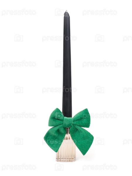 Черная свеча с зелеными бархатными луками в стеклянной стойке изолирована на белом фоне, резка готова.Очень высокое разрешение