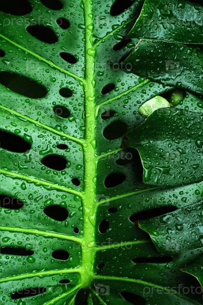 Изолированные зеленые природные листья монстров в капельках дождя