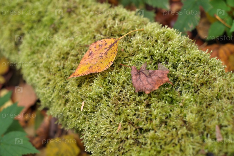 Осенний моховый бревенчик с фоном листьев, высокое разрешение
