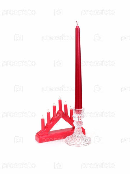 Расположение красных свечей: высокая свеча в кристаллическом держателе с красным холмом, изолированным на белом фоне, вырезка готова