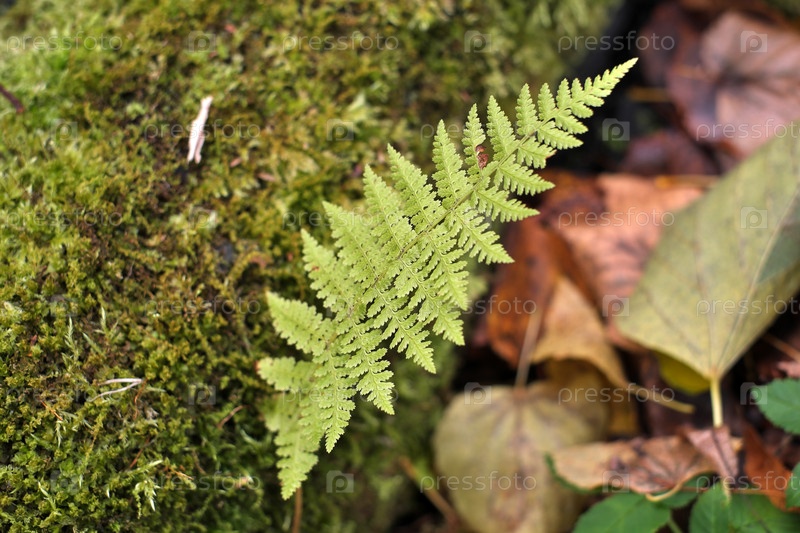 Моховый бревенчик с зеленым папоротником и осенними листьями на лесном фоне, высокое разрешение