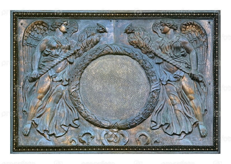 Бронзовая декоративная панель с богинями славы и победы, изолированной на белом фоне