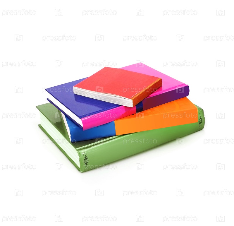 Куча книг в цветных обложках с белыми листами, изолированными на белом фоне